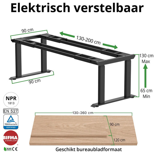 Heb je zelf een mooi bureaublad? Combineer dan je eigen bureaublad eenvoudig met één van onze bureau-onderstellen. Dankzij de verstelmogelijkheden van de diverse bureauframes passen de meest voorkomende afmetingen bureaubladen. Kies een geschikt elektrisch verstelbaar onderstel en monteer eenvoudig je bureaublad op het onderstel.